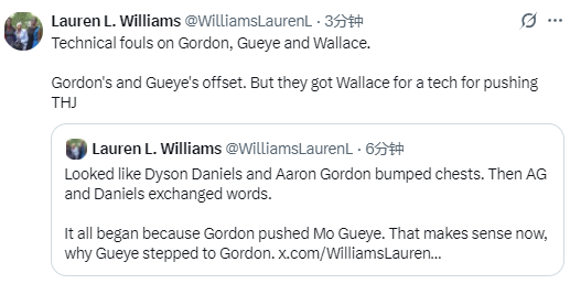 裁判最终吹罚阿隆-戈登、盖耶和华莱士各吃到1次技术犯规,丹尼尔斯则没有被处罚。