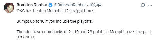 此役取胜后,雷霆队也取得了对灰熊队的12连胜,自从2022年12月以来,灰熊队就再未赢过雷霆队。而且需要注意的是,在过去9个月的时间里,雷霆队已经3次大逆转击败灰熊,翻盘分数分别为21分、19分和29分。