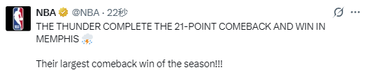 根据NBA官方发布的数据统计显示,这是雷霆队本赛季所完成的最大逆转,而且需要注意的是,本场比赛,雷霆队的亚历山大、切特-霍姆格伦和哈尔滕施泰因都没有出战。