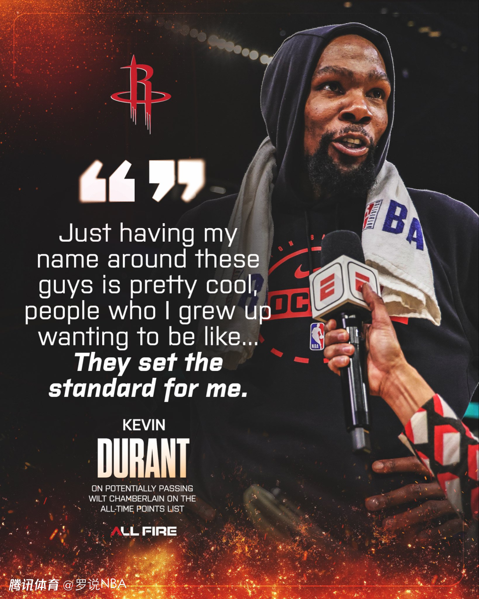 上个月,杜兰特成为联盟第八位生涯总得分突破31000分的球员,当时他坦言,能够与詹姆斯、贾巴尔、卡尔-马龙、科比、乔丹、诺维茨基和张伯伦这些名宿并肩,对他意义重大。