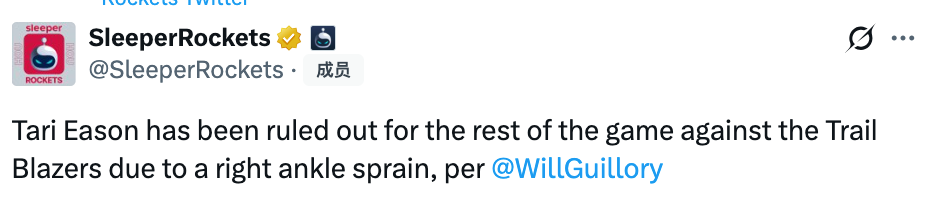 2026-01-10 13:20北京时间1月10日,NBA常规赛,火箭客场对阵开拓者,伊森遭遇脚踝扭伤,火箭官方宣布,伊森因为脚踝扭伤提前退赛,本场比赛不会回归。