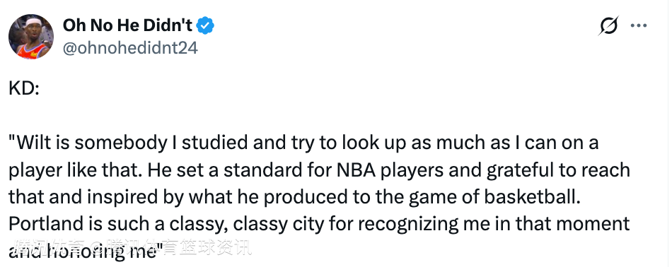 谈及自己生涯总得分超越张伯伦,杜兰特表示:“感觉太棒了。我不想低估这个成就。能与伟大的球员们并列始终是一种荣誉。张伯伦是我深入研究过的球员,我也尽可能多地去了解像他这样的传奇。他为NBA球员树立了一个标杆,我很感激自己能达到这个高度,也深受他对篮球这项运动所做出的贡献的鼓舞。”