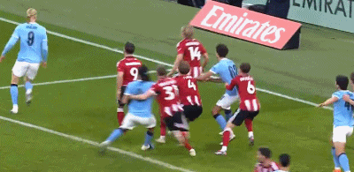 第11分钟,哈兰德头球摆渡,胡桑诺夫横传,阿莱恩挑射破门,1比0!阿莱恩打入曼城处子球。