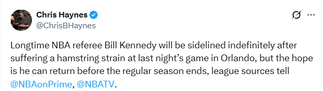 赛后,联盟官方宣布,肯尼迪因右腿伤势确定退出本场剩余执裁工作。