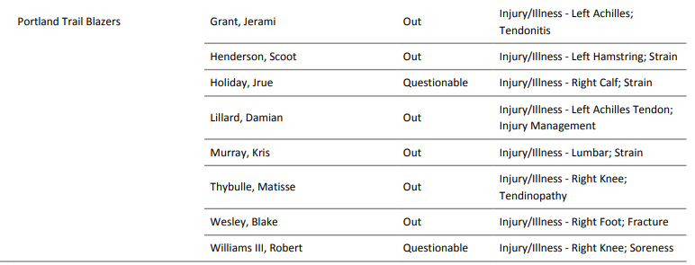 开拓者的伤情名单中,有6人确定缺阵明日的比赛,和此前相比没有变化,依然是格兰特、亨德森、利拉德、穆雷、塞布尔、韦斯利。
