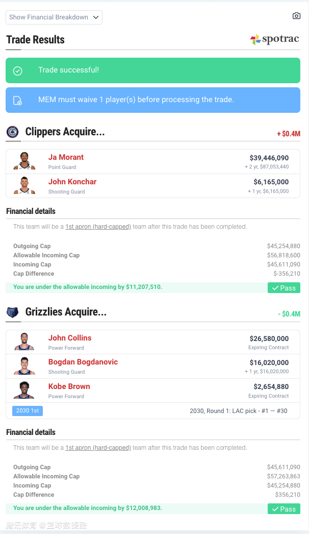 这个方案的具体细节是快船送出约翰-科林斯、博格达诺维奇、科比-布朗和2030年的乐透保护首轮签,得到莫兰特和康查尔。