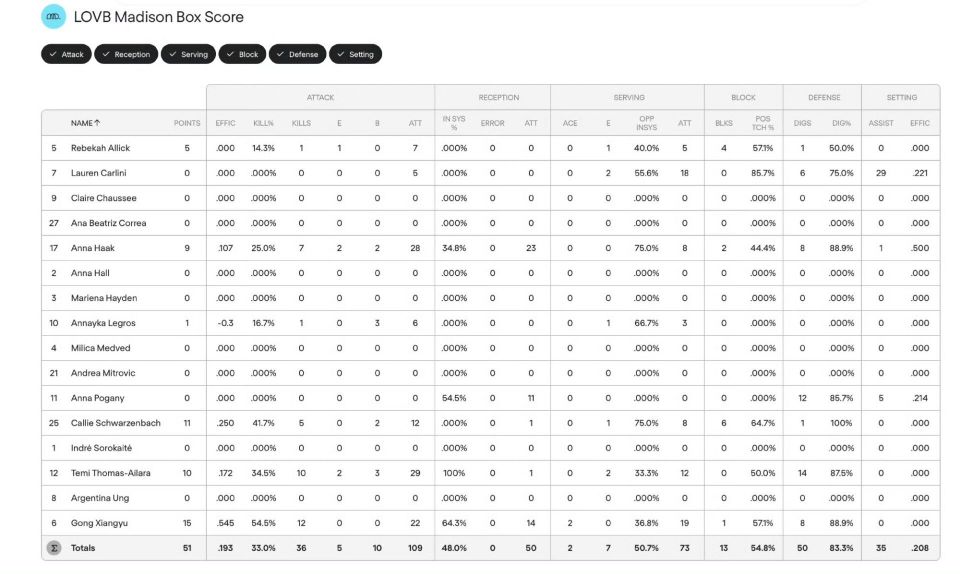 美国女排职业联赛LOVB首轮麦迪逊俱乐部球员技术统计
