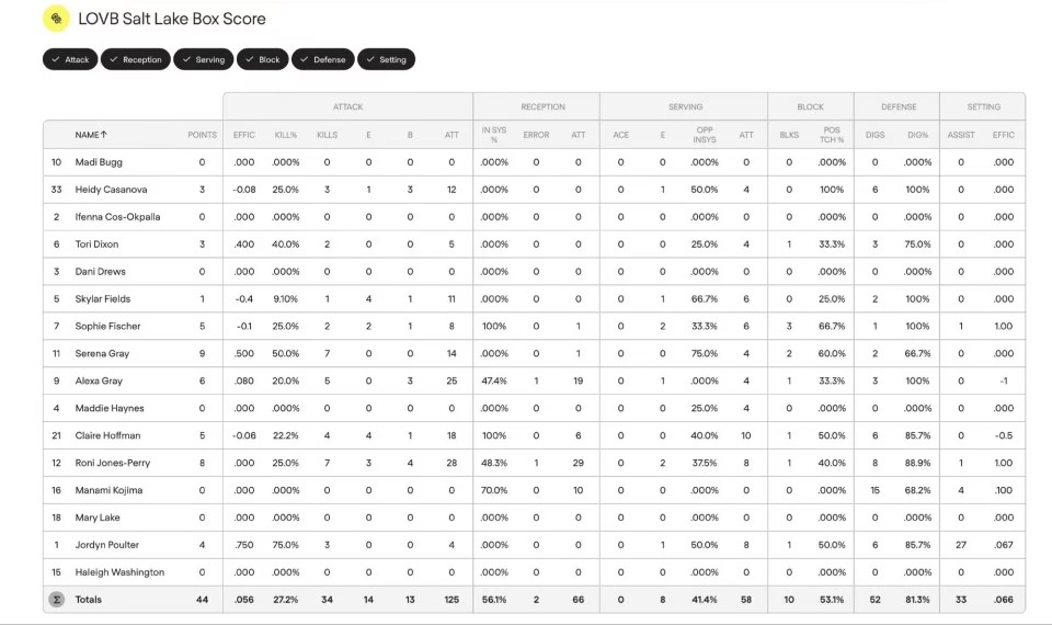 美国女排职业联赛LOVB首轮盐湖城俱乐部球员技术统计