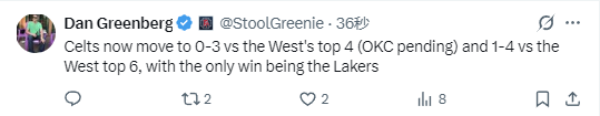 在输给马刺队之后,本赛季凯尔特人队面对西部前4名球队的战绩为0胜3负,而面对西部前6名的球队战绩为1胜4负,他们唯一击败的西部强队是湖人队。