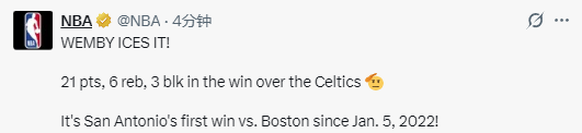 值得一提的是,上一次马刺队击败凯尔特人队时,文班亚马还没有进入马刺队。文班亚马是在2023年的NBA选秀大会上被马刺队用状元签选中,所以这也是他职业生涯首次击败凯尔特人队。