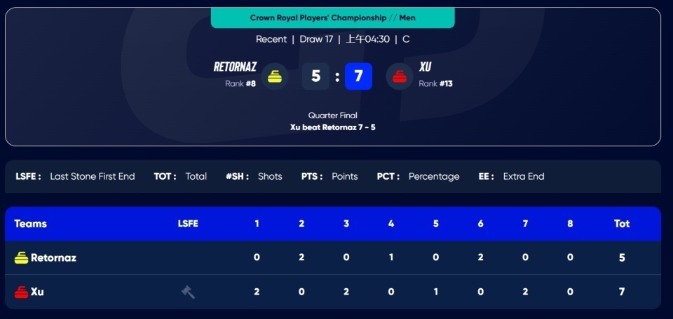 半决赛里,徐晓明队将要与世界排名11、本次赛事B组第一/总排第一的苏格兰-怀特队展开交手,竞争决赛席位。