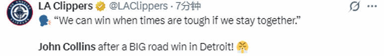 在谈到这场胜利带来的启示时,科林斯表示:“还是那句话,这是一场拼出来的硬胜利。它让我们明白,越是艰难的时刻,我们越能赢下比赛;只要全队拧成一股绳,清楚自己该做什么,始终迎难而上,打出属于我们的比赛节奏,胜利就会到来。我们一直知道自己有这个能力,但真正做到这一点,会给我们带来更多的信心。所以我说,我们今晚太需要这场胜利了。我为球队感到骄傲,大家拼尽全力、团结一致,最终在客场拿下了胜利。”