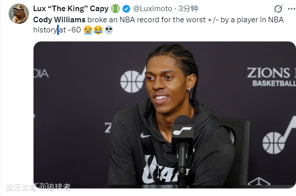 科迪-威廉姆斯出战32分钟,9投5中拿到15分2篮板,正负值低至-60,创耻辱纪录,成为NBA历史上单场正负值最低的球员;此前最低的是亨德森和厄尔共同创造的-58。