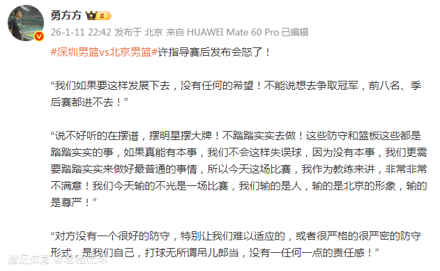 2026-01-11 23:20客场110-118不敌深圳队后,北京男篮主教练许利民在赛后的新闻发布会上非常生气。他表示,再这么发展下去,北京队别说争冠,就是季后赛都进不去。同时,他斥责有的球员摆谱耍大牌。