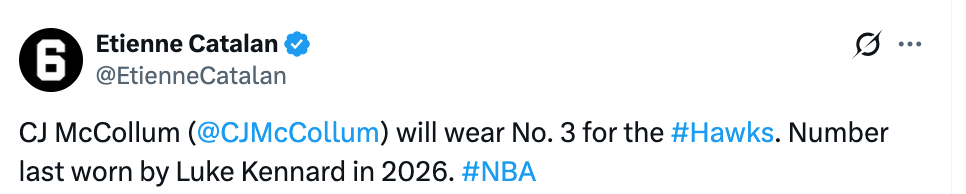 2026-01-12 00:00北京时间1月11日,据球衣记者Etienne Catalan报道,CJ-麦科勒姆在老鹰将继续身披3号球衣。