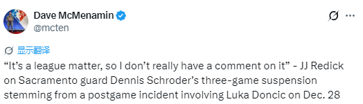 谈及施罗德因与东契奇的言语冲突及赛后试图升级冲突被联盟禁赛三场一事,雷迪克表示:“这是联盟的决定,最终由他们说了算。说实话,我对此不便过多评论。他们已经给出了裁决,而我对整个事件的来龙去脉都非常清楚。”