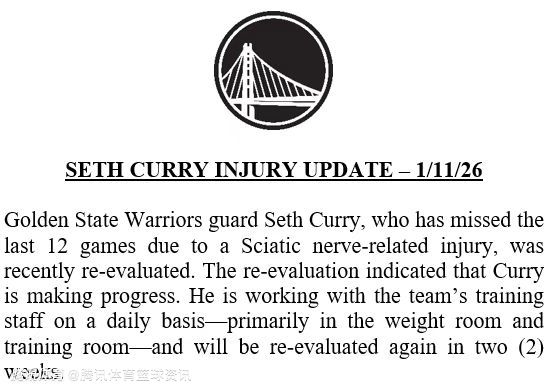 2026-01-12 08:00北京时间1月12日,勇士官方更新球队伤情公告,球队后卫塞斯-库里因坐骨神经相关伤势已缺席过去12场比赛,球队近期对其进行了复查。