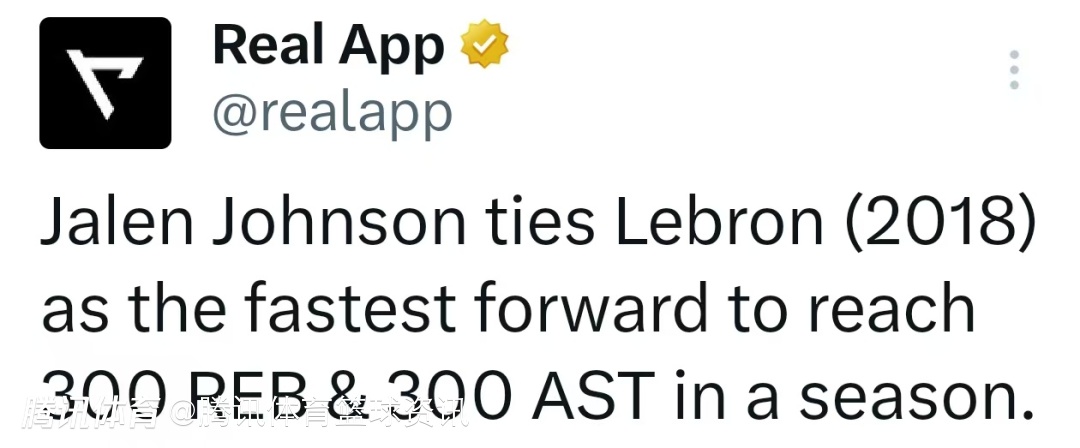根据数据统计显示,凭借本场表现,杰伦-约翰逊追平詹姆斯(2018年),成为单赛季最快达成300篮板+300助攻的前锋。