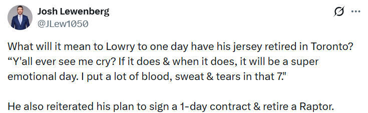 洛瑞:计划在退役前与猛龙签1天短合同 若7号球衣被退役会流泪