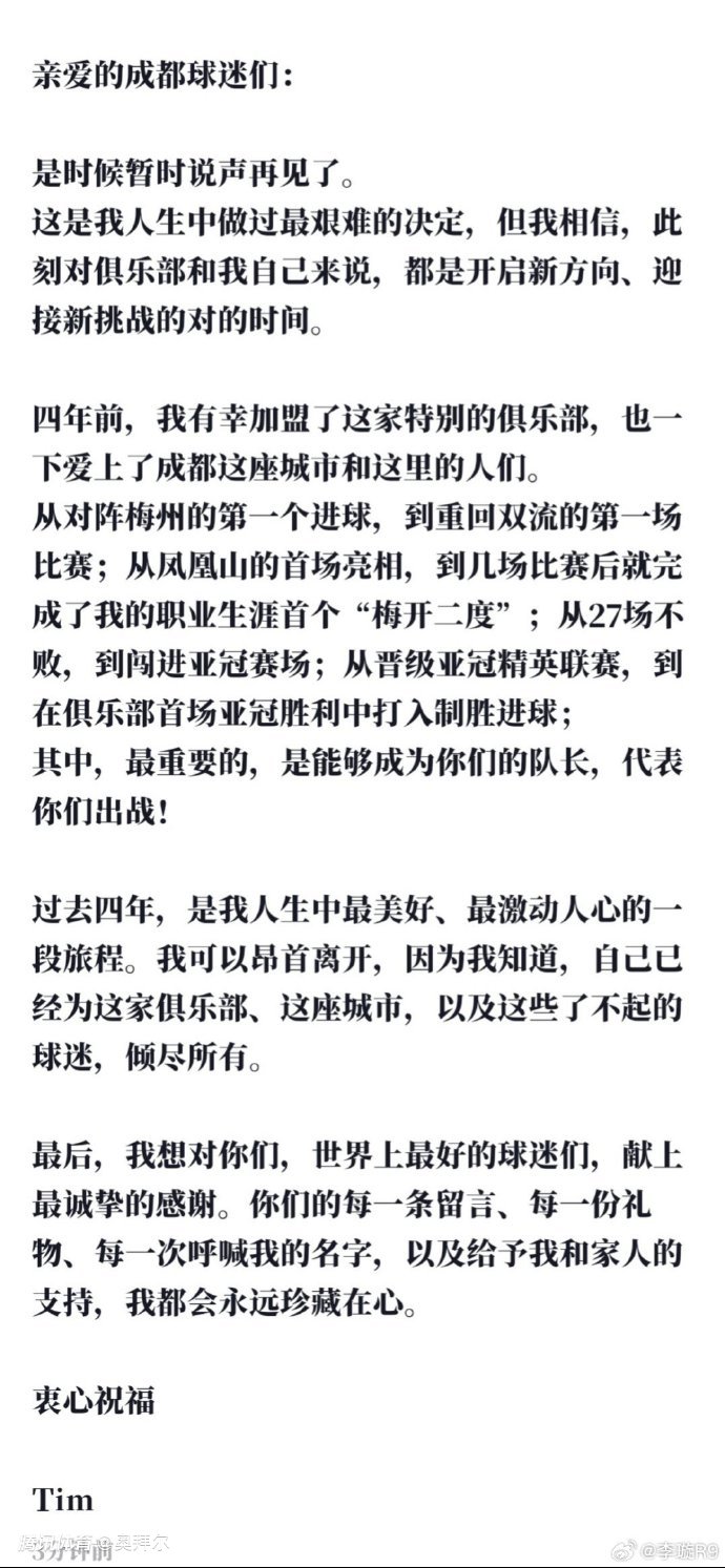 在告别信里,周定洋表示,“亲爱的成都球迷们: 是时候暂时说声再见了。 这是我人生中做过最艰难的决定,但我相信,此刻对俱乐部和我自己来说,都是开启新方向、迎接新挑战的对的时间。 四年前,我有幸加盟了这家特别的俱乐部,也一下爱上了成都这座城市和这里的人们。”