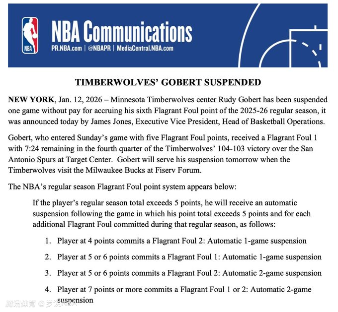 2026-01-13 05:40北京时间1月13日,NBA官方宣布,明尼苏达森林狼队中锋戈贝尔因在2025-26赛季常规赛中恶意犯规积分累计达到6分,将被无薪禁赛一场。此次禁赛将让戈贝尔损失201149美元的薪水。森林狼队也将因此获得100575美元的奢侈税差额抵免。