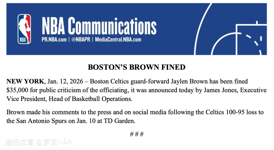 2026-01-13 06:00北京时间1月13日,NBA官方宣布,波士顿凯尔特人球员杰伦-布朗因公开批评裁判,被处以35000美元罚款。布朗是在1月11日凯尔特人于TD花园球馆以95-100不敌马刺的赛后,向媒体及社交媒体发表了相关言论。