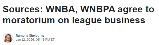 2026-01-13 07:00北京时间1月13日,据ESPN援引消息人士报道,WNBA(美国女子职业篮球联赛) 与WNBPA(美国女子职业篮球运动员协会) 已就联盟业务暂停事宜达成一致。