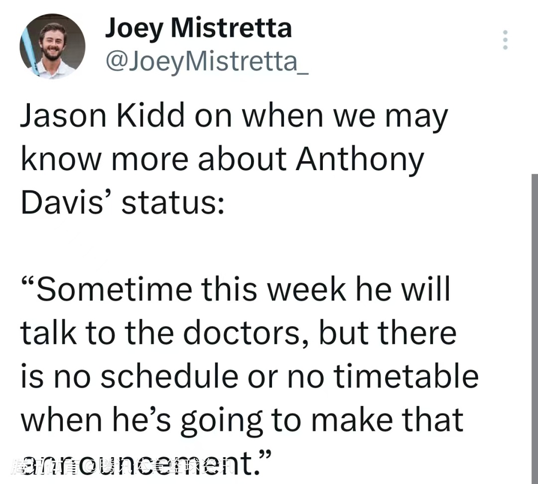 关于安东尼-戴维斯左手是否需要手术,基德说道:“我预计他会在本周内咨询医生,但何时对外公布结果,目前既没有安排,也没有明确的时间节点。”