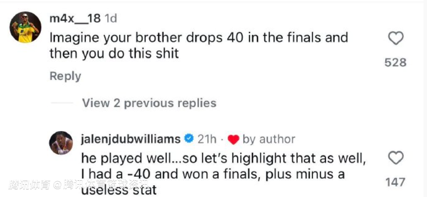 近期有球迷也在评论区写道:“试想你兄弟在总决赛轰下40分,结果你却整出这档子事。”随后杰伦-威廉姆斯也力挺科迪:“他打得其实不错,所以也该把这点提一提,我当年正负值-40还拿了总冠军呢,正负值这数据压根没意义。”