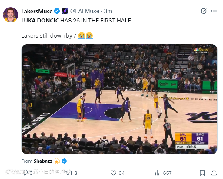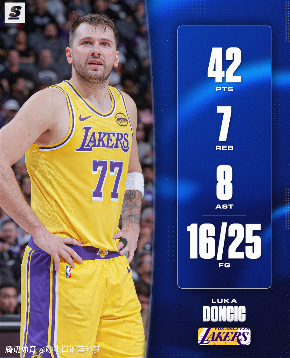 2026-01-13 14:00北京时间1月13日,湖人以112-124惨败国王遭遇三连败。这场比赛东契奇三节拿到40+但湖人还大比分落后国王,末节湖人一度缩小到7分又被拉开,湖人输在自己糟糕的防守,东契奇全场42+8+7+4抢断沦为空砍。