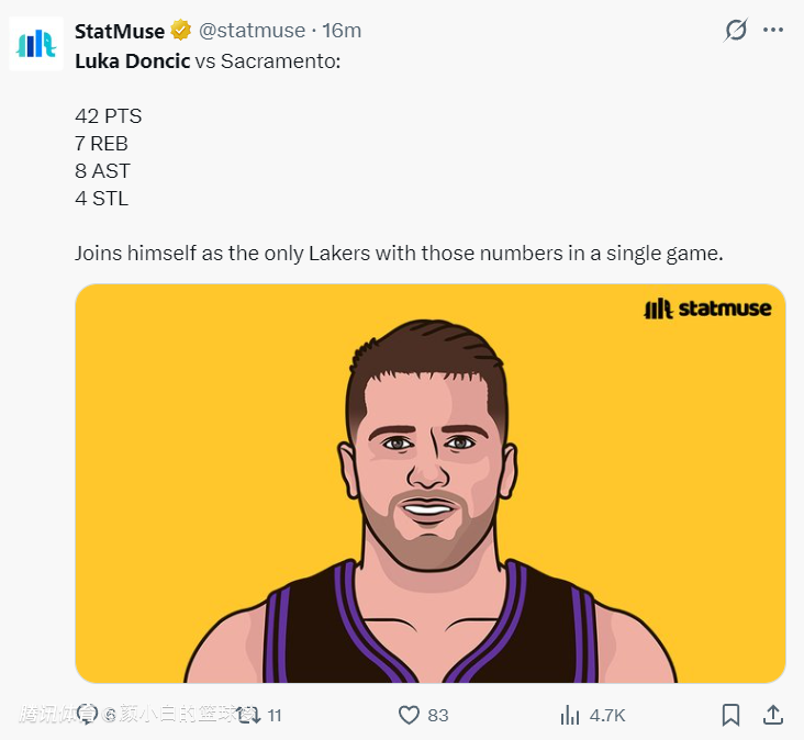 美媒:东契奇是湖人队史第一位单场至少42+8+7+4抢断的数据。