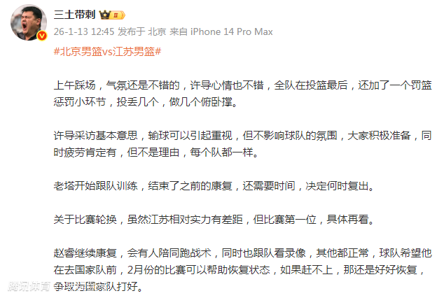 媒体人三土带刺透露:“上午踩场,气氛还是不错的,许导心情也不错,全队在投篮最后,还加了一个罚篮惩罚小环节,投丢几个,做几个俯卧撑。”