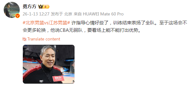 而媒体人勇方方则称:“许指导心情好些了,训练结束表扬了全队。至于这场会不会更多轮换,他说CBA无弱队,要看场上能不能打出优势。”