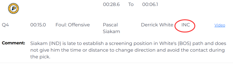 这次漏判出现在距离比赛结束还有15秒。报告指出,西亚卡姆在怀特的行进路线上建立掩护位置时动作过晚,且在挡拆过程中,未给怀特留出足够的时间和空间变向,没能避免身体接触。这是非法掩护,一次漏吹的进攻犯规,步行者获利,凯尔特人吃亏。
