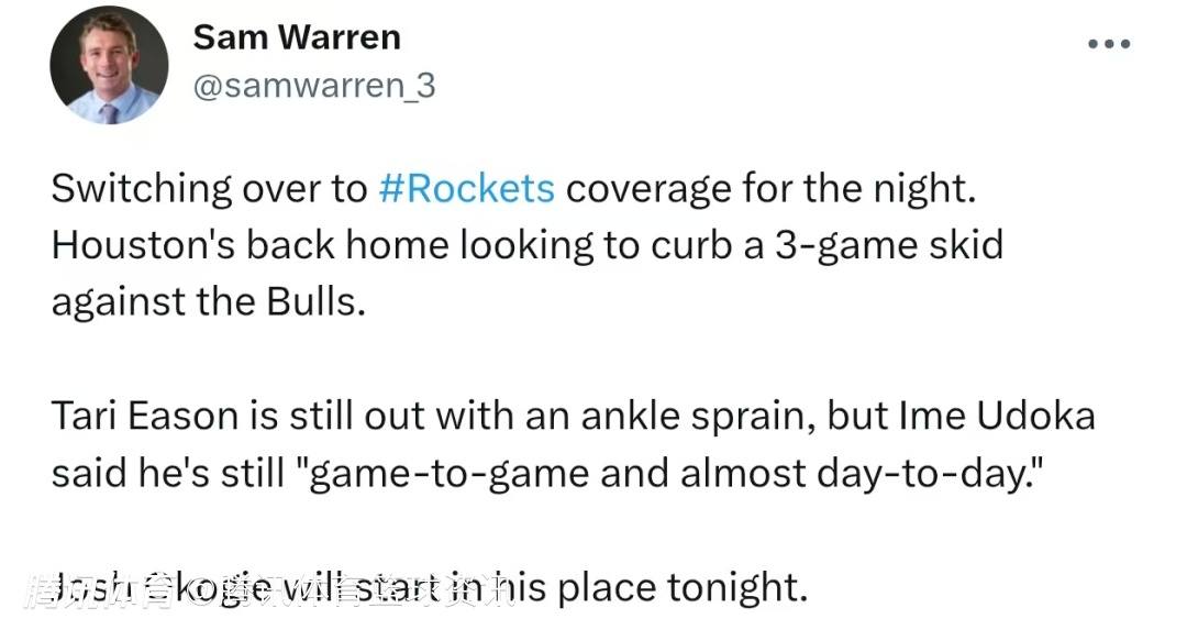 2026-01-14 08:30北京时间1月14日,NBA常规赛继续进行,火箭对阵公牛。赛前,火箭主帅乌度卡在接受媒体采访时,更新了两位球员的最新情况。