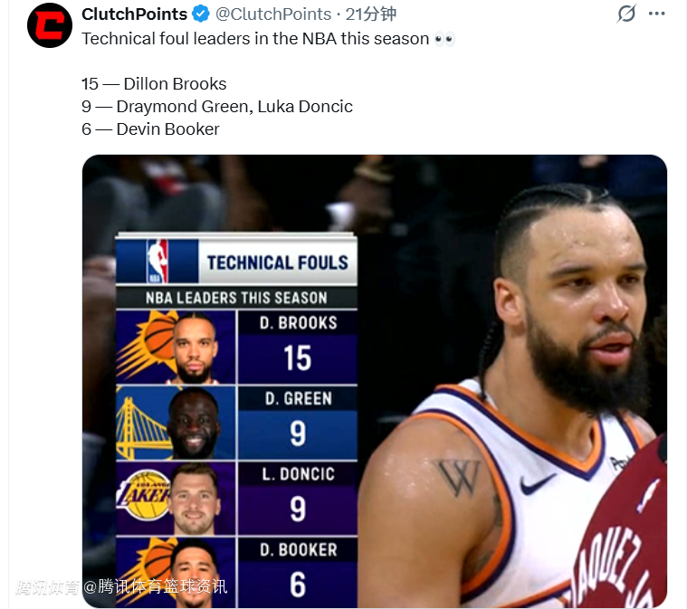 最终裁判吹罚了狄龙技术犯规,现场转播放也晒出了本赛季联盟技术犯规次数排名:狄龙15次技犯遥遥领先,身后是格林和东契奇的9次,布克的6次。