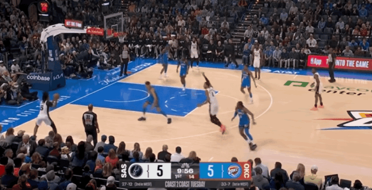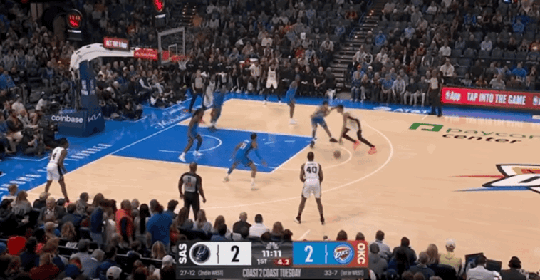 由于雷霆中锋哈尔滕施泰因因伤缺阵,雷霆阵中明显缺乏限制文班亚马的对抗力量。文班亚马下一个进攻回合甚至与卡斯尔完成空接默契配合,再次隔扣霍姆格伦得手。没想到仅仅开局3分钟,文班亚马就碾压霍姆格伦完成2次隔扣。