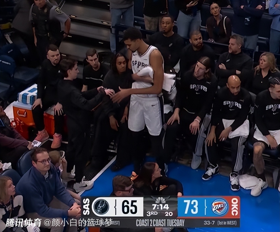 第三节亚历山大被文班亚马制造进攻犯规,文班亚马的膝盖被撞只能下场检查休息。