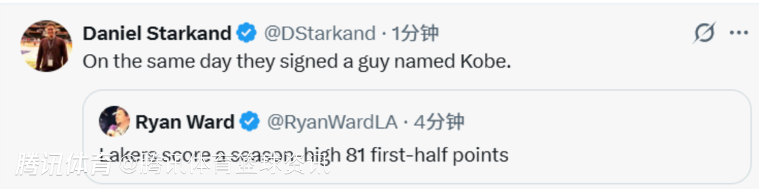 湖人队记表示,球队在上半场砍下了赛季新高的81分(这也是科比生涯单场最高分),这是他们自2024年以来的半场最高得分,值得一提的是,就在今天,湖人刚刚签下了科比-巴夫金(又一位名叫科比的球员),如今在上半场紫金军团又砍下81分,确实是一种冥冥之中的巧合。