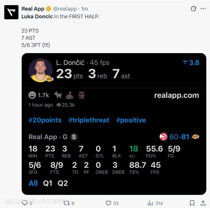 上半场湖人81分创造2024年后的新高,半场12个三分也是赛季新高,东契奇18分钟,三分6中5拿到23分7助攻3篮板1盖帽,除了三分球就是罚篮没有任何一个两分球。