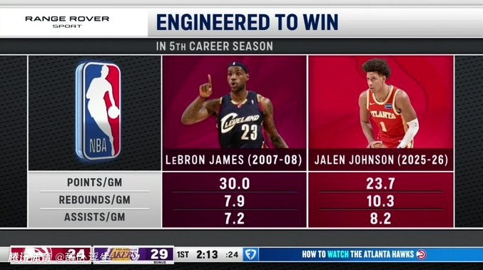 老鹰官推转发核心杰伦与詹姆斯生涯第5季数据对比,杰伦得分逊色,但篮板与助攻均优于同期詹姆斯。
