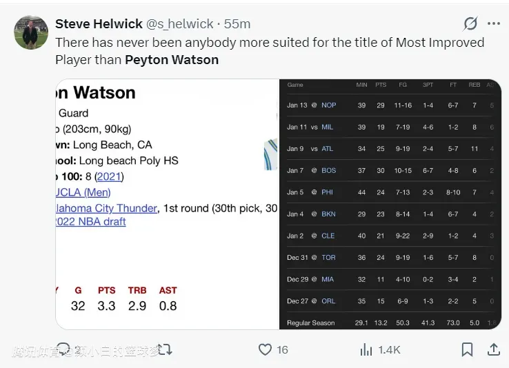 掘金记者晒出沃特森生涯四个赛季的数据对比,生涯从3.3-6.7-8.1-13.2,而且在约基奇缺席的比赛中他已经场均24.6分,这位23岁的年轻人展现了不俗的天赋上限,他今夏是有希望跟掘金谈一份五年1.25亿的合同的,类似布劳恩。