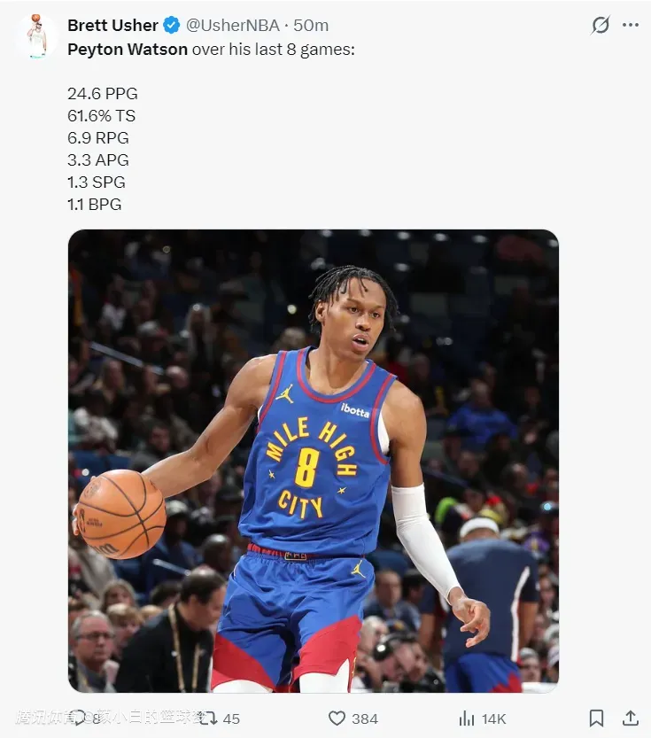 无约基奇8战5胜!沃特森场均25+7被挺MIP 在场+18今夏可冲亿元