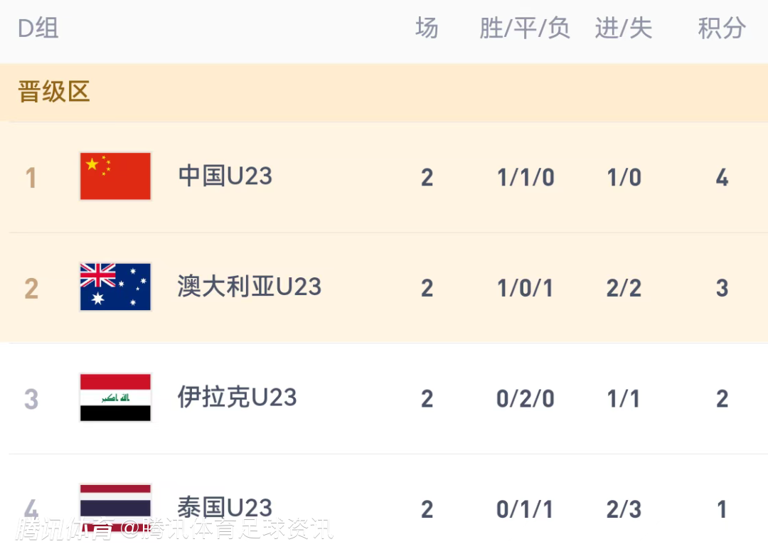 目前D组积分榜上,U23国足1胜1平积4分,位列榜首,本场比赛打平即可出线;泰国U23以1平1负积1分,位列第4。两队曾在去年10月有过两次交手,U23国足1胜1平保持不败。