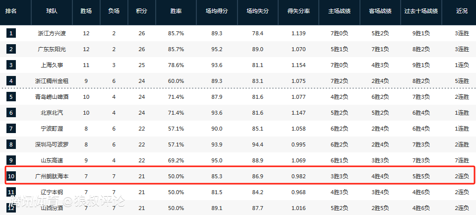 广州男篮目前的战绩为7胜7负排在积分榜第10,郭艾伦持续高挂免战牌,主帅米切尔依靠徐昕,刘颜诚,陈国豪等年轻球员,打出了50%胜率,以目前14轮的阶段,足以称得上优秀。