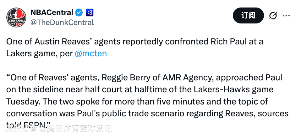 据消息人士向ESPN透露,在湖人上场和老鹰的比赛半场休息时,里夫斯的经纪人之一雷吉-贝里,在中场附近的场边找到了里奇-保罗,两人交谈了超过五分钟,话题正是保罗公开提出的关于里夫斯的交易设想。