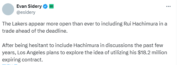2026-01-15 07:00北京时间1月15日,据记者Evan Sidery报道,在交易截止日前,湖人对将八村垒纳入交易的态度展现出前所未有的开放。