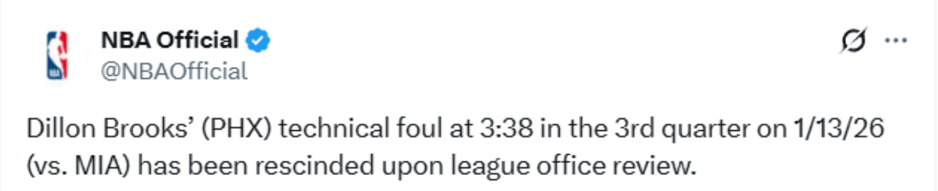 2026-01-15 09:30北京时间1月15日,NBA官方宣布,经联盟办公室审查,狄龙-布鲁克斯在1月14日对阵热火的比赛第三节3分38秒领到的技术犯规已被取消。