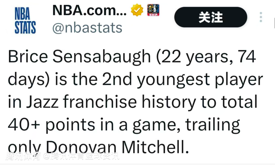 根据数据统计显示,森萨博(22岁74天)就此成为爵士队史单场砍下40+得分的第二年轻球员,仅次于多诺万-米切尔。