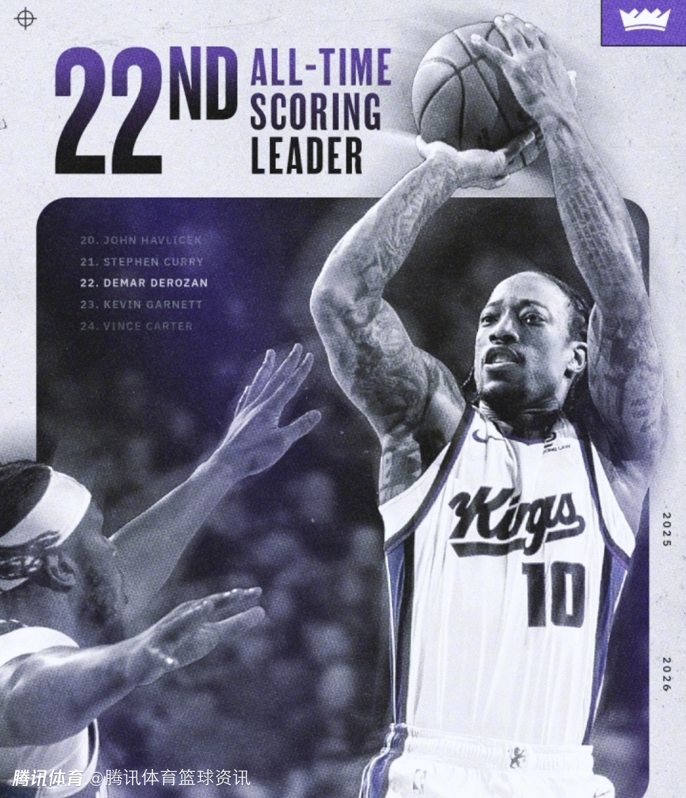2026-01-15 13:20北京时间1月15日,NBA常规赛,国王对阵尼克斯,德罗赞在本场比赛迎来里程碑,让自己生涯总得分超越加内特,升至历史第22位。